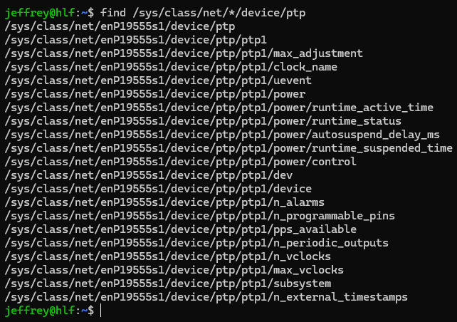想知道電腦是否支援 PTP,還有更快的做法是 ls /dev/ptp*,若有出現 /dev/ptp0、dev/ptp1 代表有偵測有支援 PTP 的硬體。而另個快速找出哪張網卡支援 PTP 的做法是用 find /sys/class/net/*/device/ptp 搜索: