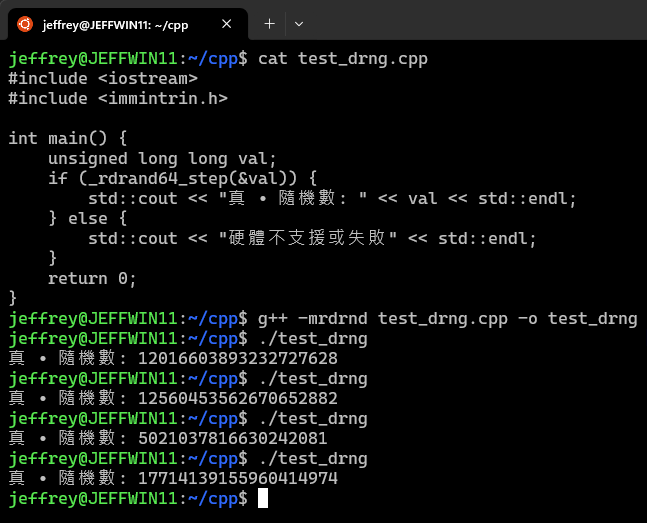 Linux GCC 有 -mrdrnd 編譯參數及 immintrin.h 方便呼叫 CPU 的硬體隨機數產生器,為求簡化我在 Winodws 用 WSL 測試。