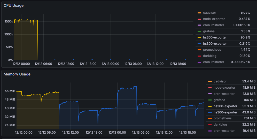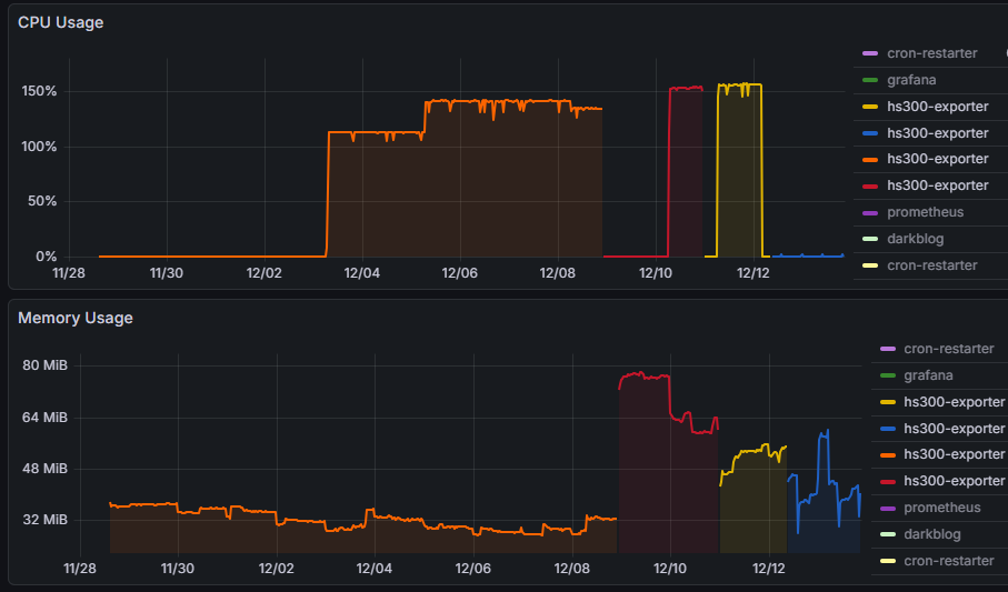 現在有 cAdvisor + Prometheus + Grafana 圖表可看,Docker 行為無所遁形,證實雖然已重寫成 Promethues Exporter 版,仍屢屢發生數小時到幾天後 CPU 衝上 120% 甚至 160% 的狀況。(圖表裡有不同顏色的 hs300-exporter,每條代表一次 docker compose 重啟的新程序)