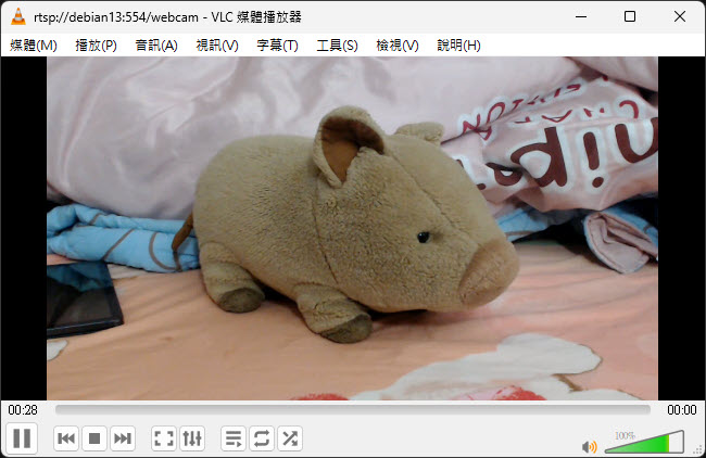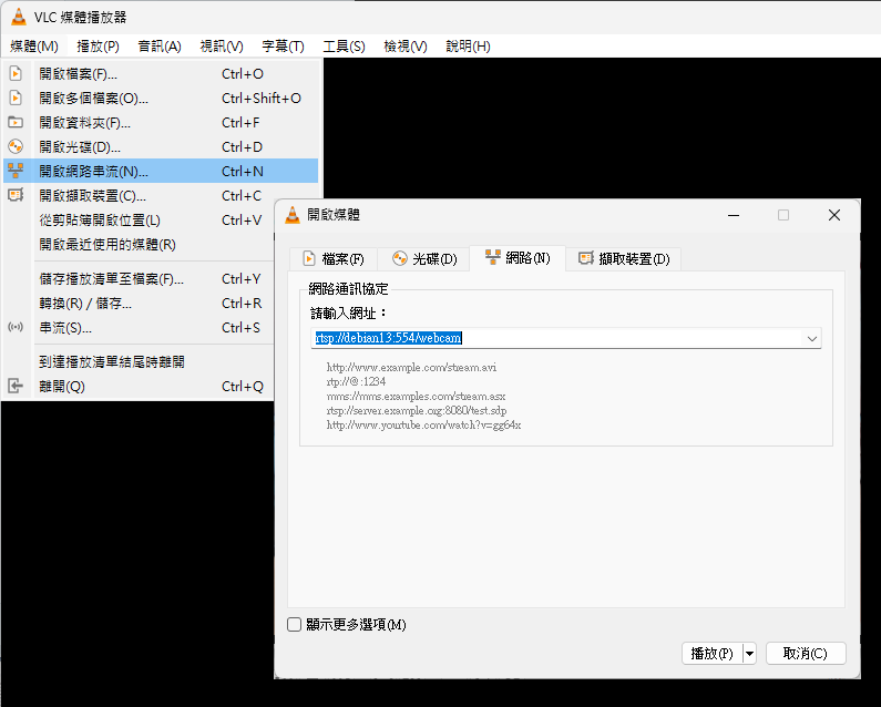 RTSP (Real-Time Streaming Protocol) 是一種應用層的網路控制協定,主要用於客戶端與伺服器之間建立、控制和管理多媒體串流會話(音訊、視訊直播或點播),RTSP 本身不負責傳輸實際媒體資料而是扮演遙控器的角色,告訴伺服器要「播放」「暫停」「快轉」或「結束」串流,真正的媒體資料則由 RTP (Real-time Transport Protocol) 或 SRTP 協定負責傳送。若網路攝影機支援 RTSP,我們便可透過 rtsp://<ip-addr>:554/steam-name 這種格式的 URI 連上攝影機,播放即時影像。而測試 RTSP 最好的工具,非萬能開源媒體播放器 - VLC Media Player 莫屬。點選選單「媒體 / 開啟網路串流」,輸入 rtsp://... URI,即可收看串流影像:
