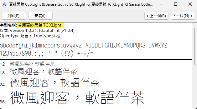 - 至於 Unhinted 版,指的是不在字型檔嵌入數學指令以輔助顯示對齊像素格(術語叫 Hinting 字型微調)的版本,如此能更忠於字型輪廓原始設計,避免因強制對齊像素格失真,但在 Windows/Linux 低解析度或小字時易出現模糊、筆劃粗細不均、邊緣鋸齒等現象。