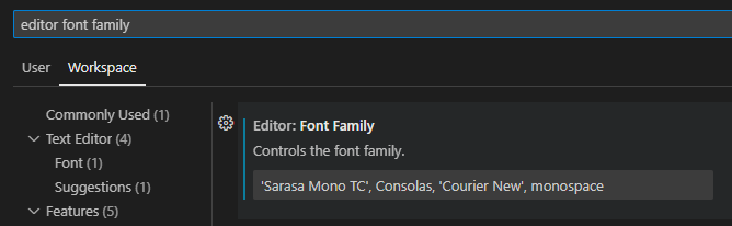"editor.fontFamily": "'Sarasa Mono TC', Consolas, 'Courier New', monospace"