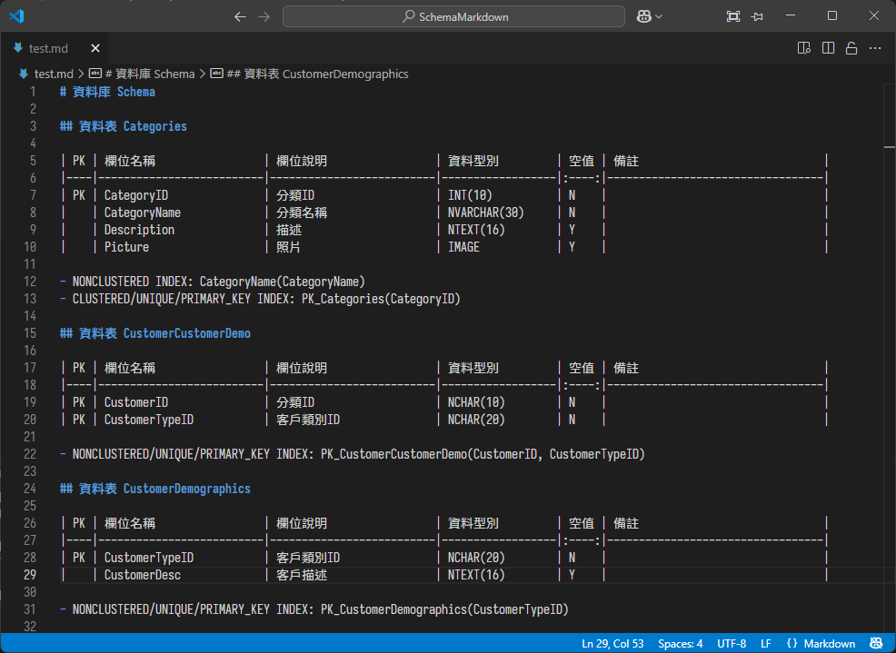 昨天介紹了 SQL Schema 轉 Markdown 重溫用 PE2 打表格的做法,其中有個小茶包:
