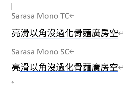 補充:也有不少人愛用的 Mapple Mono NF SC,我沒選擇的原因是它以簡體為主,未針對繁體中文優化,有些字不符合台灣的標準寫法。同一組字分別設成 Sarasa Mono TC 跟 SC 便能看出差異:(參考:小心!GB 18030 就在你身邊)