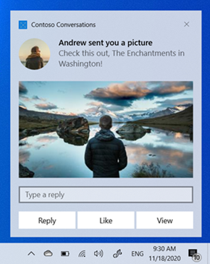 Windows 10 開始,在桌面右下角增加了應用程式通知功能,允許背景執行程式在桌面彈出快顯型通知,甚至還能加上圖檔、按鈕、文字輸入框,提供可互動介面。