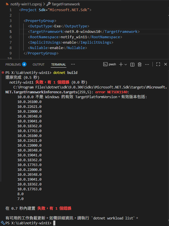 <TargetFramework>net9.0-windows10.0.17763.0</TargetFramework>,不然程式會找不到 .Show() 方法。SDK 版號主要控制編譯時的 API 相容性檢查,並非執行時期支援的最低作業系統版本,想知道有哪些版號,有個簡單做法是用 net9.0-windows10 引發編譯錯誤,錯誤訊息有完整清單:
