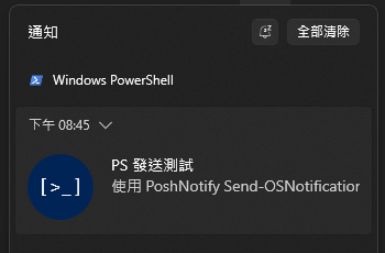 Send-OSNotification -Title "PS 發送測試" -Body "使用 PoshNotify Send-OSNotification 發送"