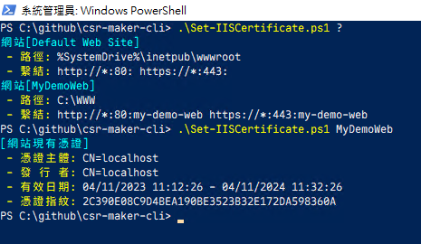 比照上次部署及資安審核考量,一樣選擇用 PowerShell 開發,我寫了一個 Set-IISCertificate.ps1,用法如下: