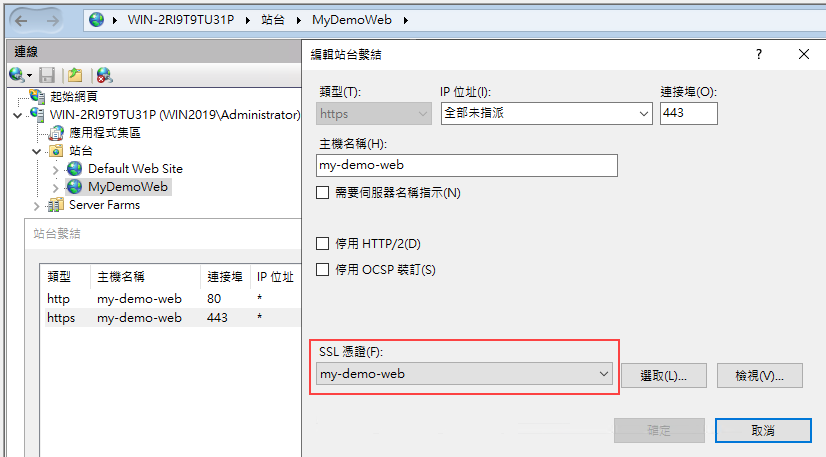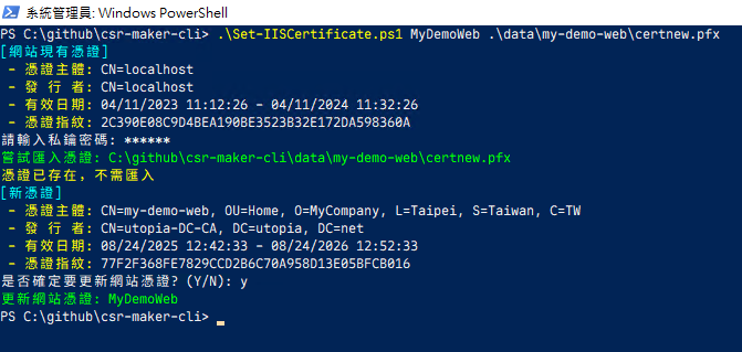 接著,讓我們用一行 Set-IISCertificate.ps1 "MyDemoWeb" "X:\path\certnew.pfx" 把 IIS 憑證換掉。