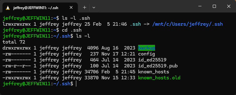 Windows 與 WSL 的 ssh 程式採用相同檔案挸格(known_hosts、config、公私鑰檔),共用不是問題,但二者各有自己的 .ssh 資料夾,Windows 在 C:\Users\<userName>\.ssh,而 WSL 在 ~\.ssh,相當於 \\wsl$\Ubuntu\home\<userName>\.ssh。(延伸閱讀:何用 Windows 檔案總管瀏覽 WSL 的資料夾)。
