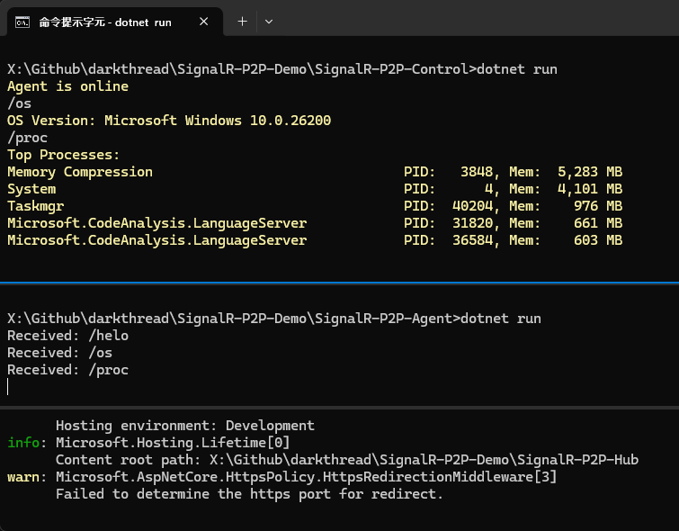 ASP.NET Core Web Razor 專案,安裝 Microsoft.AspNetCore.SignalR.Core 套件,依官方教學 Program.cs 加上 builder.Services.AddSignalR(); 及 app.MapHub 為了增加安全性,一方面也為實戰預做準備,順手加上兩層安全管控:IP 白名單及 Access Key 檢查。 IP 白名單部分是在 appsettings.json 列舉可連線的 IP 清單:(若不要限制來源 IP,可加入 *) Program.cs 則要插入檢查 IP 的中介層: IpWhitelistMiddleware 寫法如下: 至於 Access Key,我採取的做法是要求連線時加入 X-Access-Key Header。ChatHub 則在 OnConnectedAsync() 時檢查,若未附上 Header 或與 appsettings.json 設定不同則拒絕連線。來源 IP 的檢查也可以寫在這裡,甚至可以指派不同 Access Key 給不同 IP 進一步提高安全性。上面選擇用 Middleware 實作的一項重要理由是我想多練習一種寫法。:D 若排除 Access Key 檢查,ChatHub 本體超級簡單,只有 JoinGroup 與 SendGroupMessage 兩個方法,在 SendGroupMessage() 中,則是利用 Clients.OthersInGroup(groupName).SendAsync(..) 傳送訊息給自己以外的群組成員。 這個展示範例是讓 SignalR-P2P-Control 連上 SignalR Hub 加入指定名稱的群組,與也連上 SignalR Hub 加入同一群組的 SignalR-P2P-Agent 建立即時通訊管道。Control 端從 Console.ReadLine() 讀取指令,共有 /helo、/os、/proc 三種指令,分別用來測試 Agent 回應、取得 Agent OS 版本、查詢 Agent 上吃 RAM 前五名的程序資訊,沒啥營養,但用來驗證機制可行性很夠了。 前面提到要實作 E2E 加密,加解密部分用 System.Security.Cryptography.Aes 實作即可,由於不是本次重點,我把它包成獨立 Class Library。Control 端的 Program.cs 長這樣: Agent 端需實作收到 /helo、/os、/proc 指令時的處理,程式碼稍多,但倒也沒什麼深奧之處。 最後,分別把三者執行起來,從 Control 端下指令,順利收到 Agent 端回應,測試成功! 完整程式碼在 Github,需要的同學可自取。 Demonstrates using SignalR in .NET for secure, end-to-end encrypted P2P communication between CLI apps across networks, with IP and Access Key controls. "AllowedClientIPs": [