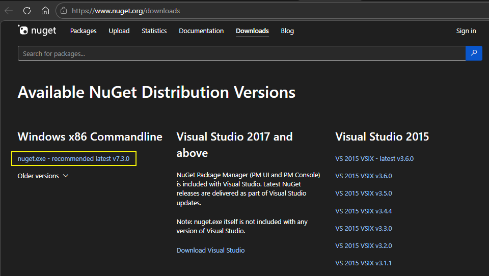 研究後,我找到的解法是從 NuGet 網站的 Windows x86 Commandline 下載 nuget.exe 回來用: