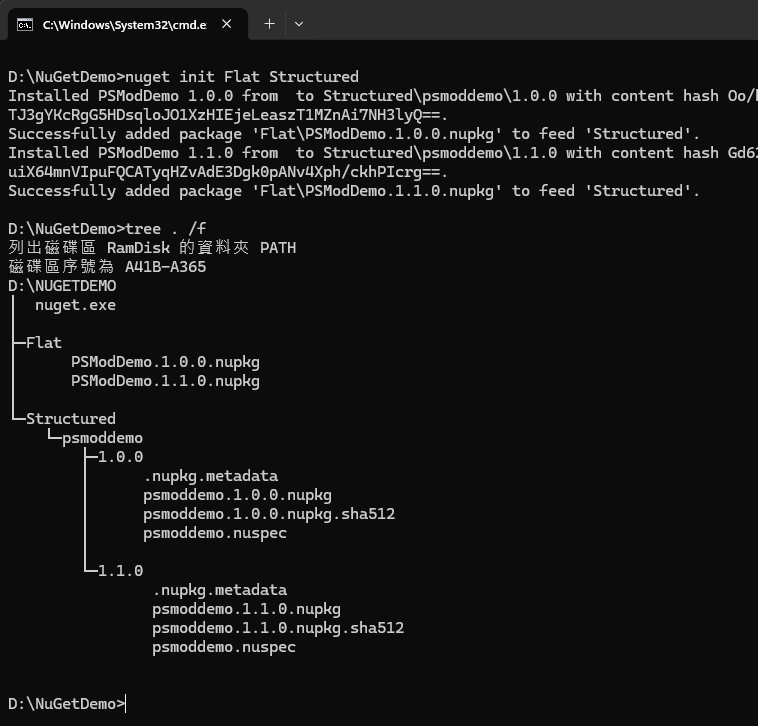 之後要再新增套件,則可執行 nuget add MyPackage.2.0.0.nupkg -Source <structured-folder> 展開單一套件。