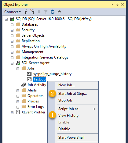維護古蹟系統時遇到一個挑戰:在 MSSQL Server 上有幾個 SQL Agent Job 排程,當需要查看執行歷史紀錄 [1] 或想手動重跑排程 [2],都必須用 SSMS 登入 SQL Server 操作: