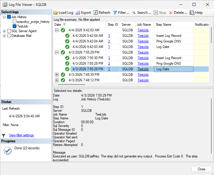 另一個更簡便的方法是使用內建系統 Stored ProcedureEXEC msdb.dbo.sp_help_jobhistory @job_name = 'TestJob', @mode = 'FULL'