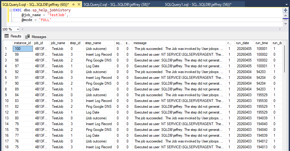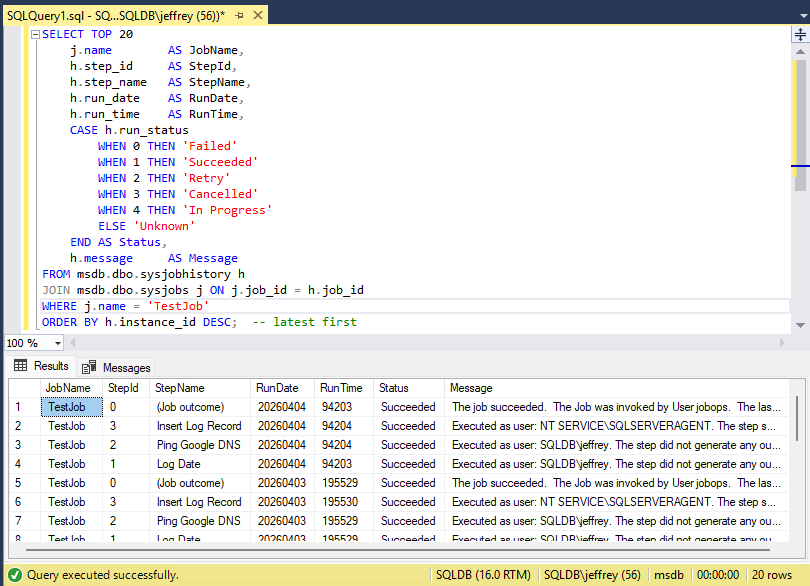 SELECT TOP (@limit) j.name AS JobName, h.step_id AS StepId, h.step_name AS StepName, h.run_date AS RunDate, h.run_time AS RunTime, CASE h.run_status WHEN 0 THEN 'Failed' WHEN 1 THEN 'Succeeded' WHEN 2 THEN 'Retry' WHEN 3 THEN 'Cancelled' WHEN 4 THEN 'In Progress' ELSE 'Unknown' END AS Status, h.message AS Message FROM msdb.dbo.sysjobhistory h JOIN msdb.dbo.sysjobs j ON j.job_id = h.job_id WHERE j.name = @jobName ORDER BY h.instance_id DESC; -- latest first