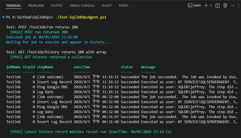 我的構想是找尋用 T-SQL 指令查詢 SQL Job 執行紀錄以及執行 SQL Job 的方法,申請專屬帳號並賦與權限以執行這兩種 SQL 指令。寫一個簡單的 ASP.NET Core Minimal API,將查詢 SQL Job 執行紀錄以執行 SQL Job 分別包成 MapGet("//history")、MapPost("//run") WebAPI,加上 API Key 及來源 IP,限定特定來源呼叫。如此,我們便可透過 curl、PowerShell 或管理網站呼叫這些 WebAPI 實現 SQL Job 的遠端操作。