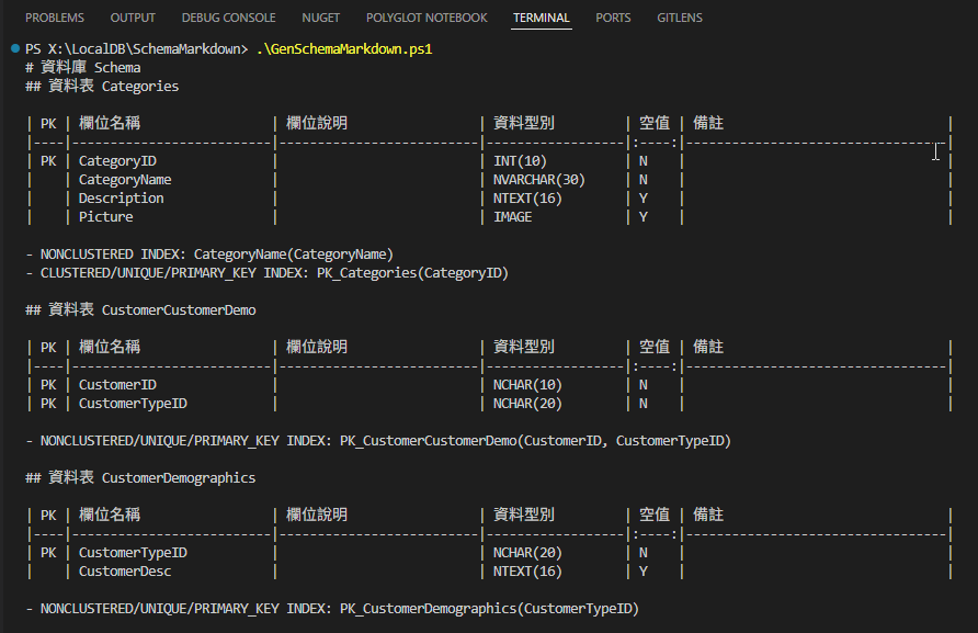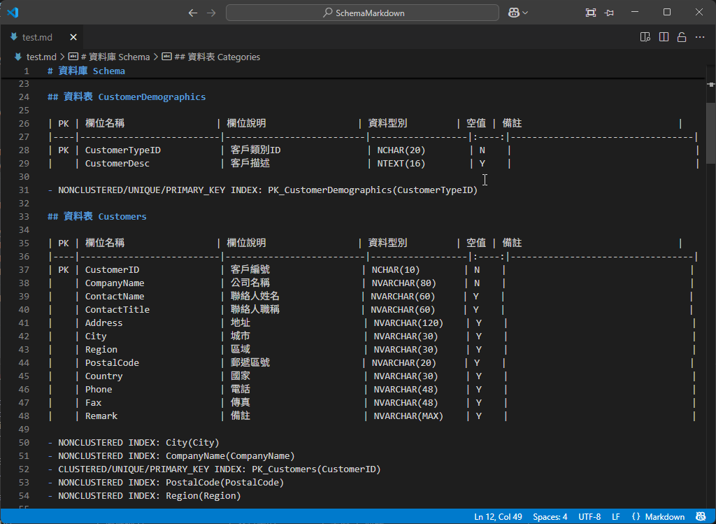 最近在整理某系統的 MSSQL 資料表結構,準備對所有欄位做一次清查,了解各欄位的用途建立基本概念。照理來說,正常人應該會找工具軟體將 Schema 匯出成 Word 或 Excel 編輯加上說明。但我這幾年寫 Markdown 成癮,很不想用 Word 寫,便興起了將 SQL Schema 匯出成 Markdown Table 再用 VSCode 編輯的想法。