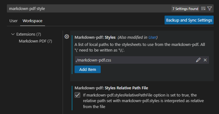 由於包含表格欄寬,這個 .css 是依 .md 量身訂做的,這種情況可以啟用 Markdown PDF 的「Styles Relative Path File」,設定路徑 markdown-pdf.css,此時 Markdown PDF 會取用 .md 同目錄下的 markdown-pdf.css,做到不同 .md 搭配專屬 .css。
