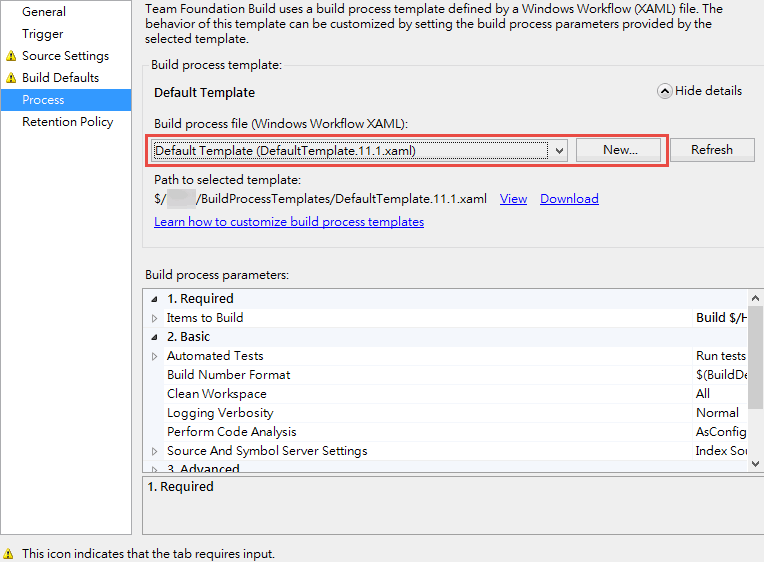 Build Service預設提供了幾種建置流程範本(Build Process Template),決定建置流程有幾個步驟,如何抓Source Code、怎麼執行測試… 等等,還可定義控制參數,顯示於下方供使用者調整,這些細節都定義在Windows Workflow Foundation(WWF)規格的XAML檔案,可用Visual Studio編譯修改,為專案量身打造專屬的建置流程,微軟很貼心地在UI 附上教學。呃… 這下連說「我不會」的機會都沒了,夠狠!(淚)