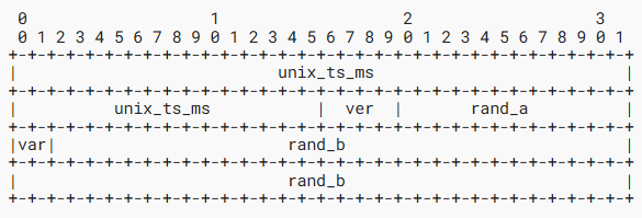 終於,IETF(Internet Engineering Task Force) 針對這些需求與現有實踐進行討論,於 2024 年 5 月發佈 RFC 9562,納入 UUIDv6、v7、v8 三個新版本。其中 UUIDv7 以毫秒(ms)級 Unix 時間戳為主體,結合隨機位元,兼顧唯一性與有序性,特別適合資料庫索引與分散式系統。