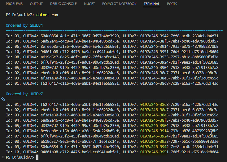 Console.WriteLine($"Id: {entry.Id:00}, GUIDv4: {entry.GuidV4}, UUIDv7: {entry.UuidV7}");