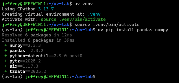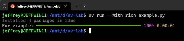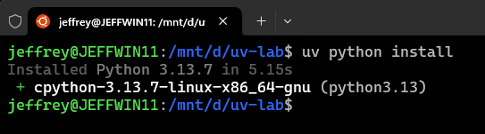 我在 WSL 測試,安裝速度很快,不到三秒完成。裝完重新登入或 source $HOME/.local/bin/env 即可使用 uv CLI。