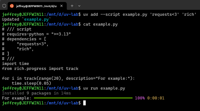 另一個更方便的做法是用 --script 在 .py 開頭加入宣告,例如 uv add --script example.py 'requests<3' 'rich',程式最前方會有一段註刪起來的宣告語法,之後不用加 --with 參數 uv 也會依據這段宣告自動下載安裝依賴的套件:
