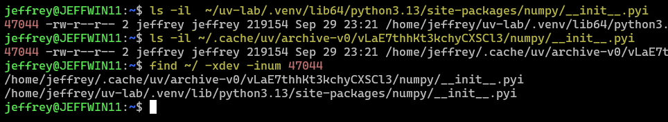 以 numpy 的 __init__.pyi 為例,用 ls -il 多顯示 inode 編號,可發現~/uv-lab/.venv/lib64/python3.13/site-packages/numpy/__init__.pyi與~/.cache/uv/archive-v0/vLaE7thhKt3kchyCXSCl3/numpy/__init__.pyi的 inode 編號相同都是 47044,代表這兩個檔案指向同一磁碟位址,實際上只有一份資料。而用find ~/ -xdev -inum 47044反查,一樣能證明兩個路徑都指向同一份檔案內容。