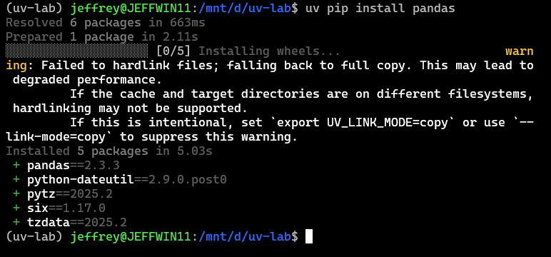 註:Hard-Link 限定同一磁碟分割,若虛擬環境與快取位於不同磁碟,uv 將退回複製檔案之傳統做法並提出警示: