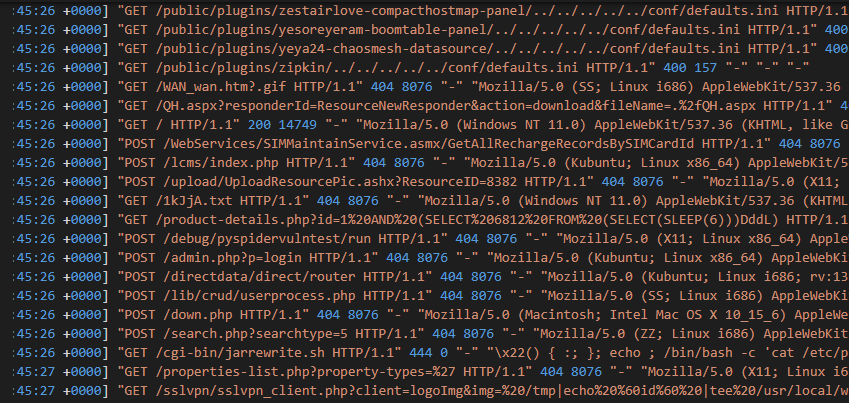 GET /public/plugins/grafana-clock-panel/../../../../../conf/defaults.ini這個請求明確針對 Grafana 平台,嘗試利用插件路徑進行路徑遍歷,讀取 Grafana 的預設設定檔。