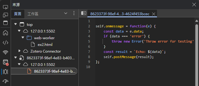 - Web Worker 跟一般 JavaScript 一樣可以用 F12 Dev Tools 偵錯,你可以在來源 (Source) 的頁面樹狀圖找到它: