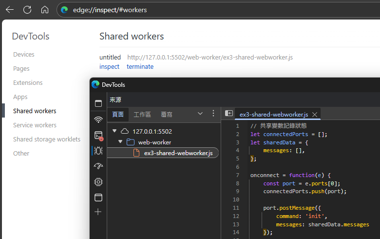 Shared Worker 的話,請另開新頁籤輸入edge://inspect#wokrers或chrome://inspect#workers找到它: