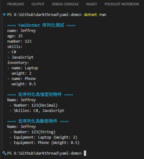 至於要用 .NET 讀寫 YAML,目前還沒包含在 .NET 內建支援程式庫,較知名的兩套程式庫是 YamlDotNet 及 VYaml,YamlDotNet 較成熟使用者較多,依據西瓜偎大邊定理成為我的選擇,用它來做個簡單 YAML 讀寫練習。